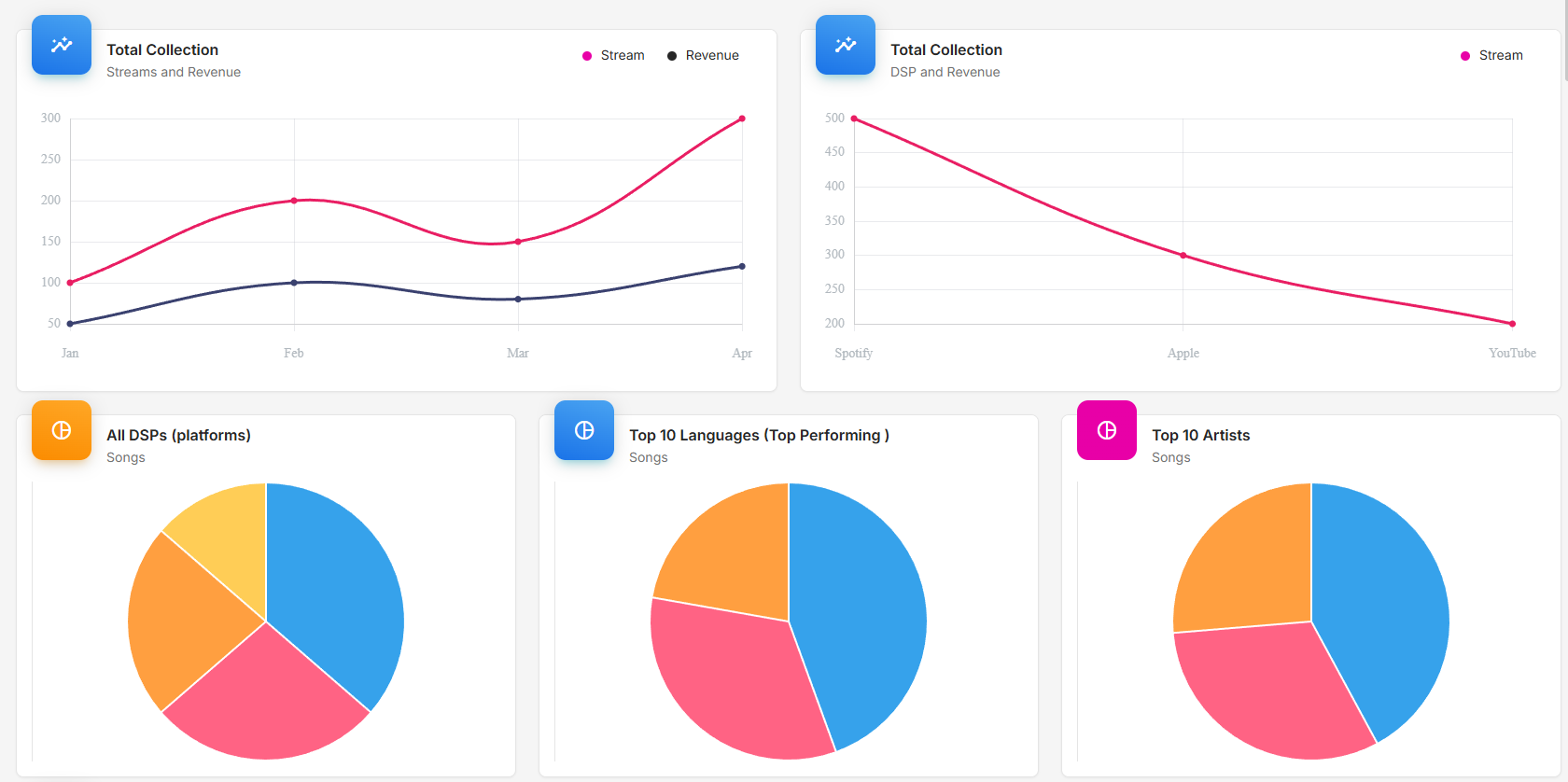Get detailed reports on track performance, streaming data, and revenue. Monitor trends to optimize your artists’ reach and earnings.